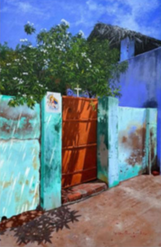 Vernacular House this stunning 24 x 36-inch original, Kolipitchai Prabhakar captures the weathered beauty of traditional Indian dwellings. The composition features a striking orange gate set against a sky-blue wall, softened by the organic greenery of an overhanging tree. The artist's mastery of light and shadow is evident in the dappled sunlight hitting the turquoise pillars, creating a nostalgic, sun-drenched atmosphere that feels both quiet and alive.